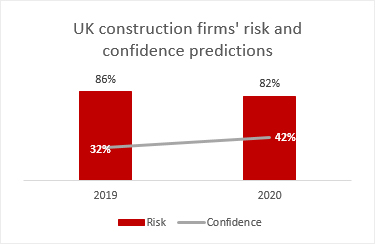 Confidence within the UK construction industry is set to bounce in 2020, when 42% of construction business leaders are upbeat about the ability of their business to grow and prosper compared to only 32% in May 20191. Similarly, construction bosses think the risk environment will improve next year, with 82% believing they will be operating in a medium to high risk environment in 2020, compared to 86% in the spring this year.