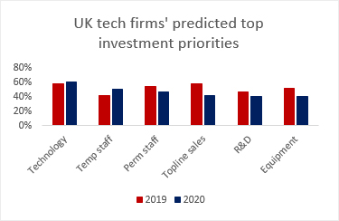 This should be a confident sector as we enter 2020, and it is clear that companies in the sector want to keep doing what they’re good at. Their highest priority for investment in 2020 is technology itself, with 60% seeing this as a key investment focus where spend will increase. But on every other measure technology firms are pulling in their investment horns and preparing for an economic storm. They plan to reduce investment in staff, R&D, topline sales development, corporate development and equipment – everywhere in fact.