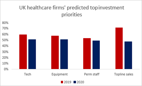 These risk concerns are impacting Healthcare firms’ investment plans with a wholesale decrease in investment across all the main areas of their business predicted in 2020, with notable reductions in topline sales, tech, and equipment and the hiring of permanent staff.