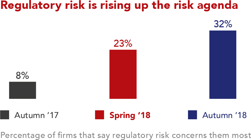 The most significant and unexpected finding of the survey is that regulatory risk, which barely registered as a concern in previous surveys, has broken through as the second-most concerning risk on the C-suite agenda after cyber – seen as a key risk by 23% of executives, rising to 32% as we move into Autumn ‘18.